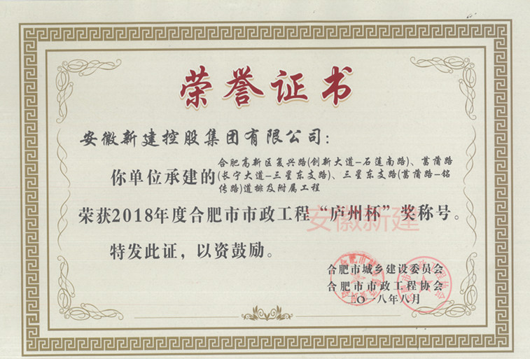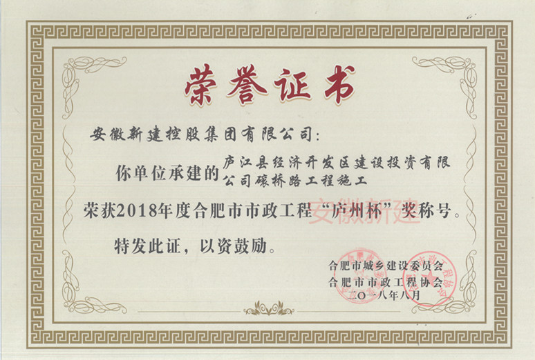 合肥市市政工程“廬州杯獎(jiǎng)(市優(yōu)質(zhì)工程)是合肥市市政工程質(zhì)量最高獎(jiǎng)項(xiàng)。此次的榮譽(yù)表彰,激勵(lì)了我們新建人積極向上的蓬勃斗志,同時(shí)展現(xiàn)了企業(yè)“努力自強(qiáng)、追求卓越”的精神風(fēng)貌。