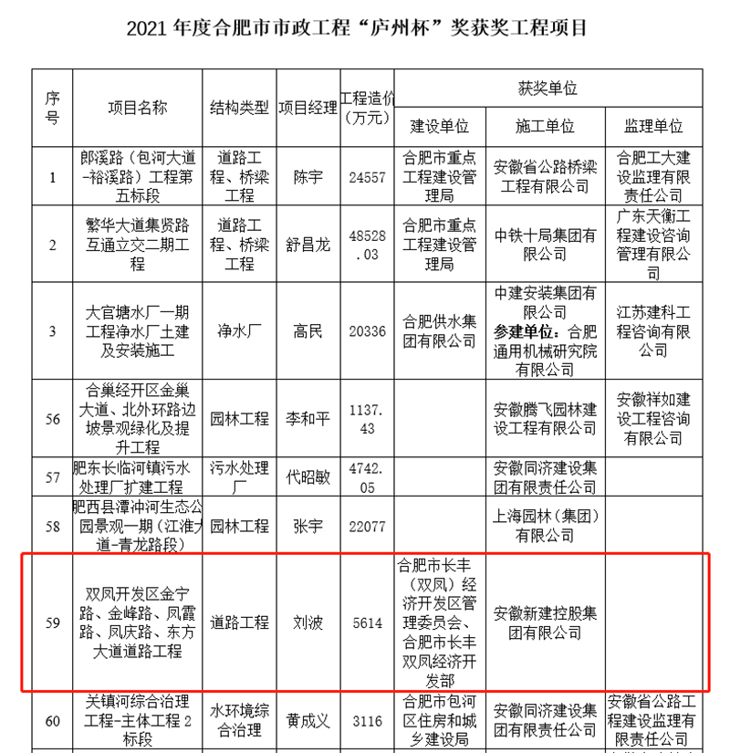 8月26日,合肥市市政工程協(xié)會公布《關(guān)于表彰2021年度合肥市市政工程“廬州杯”獎的決定》,安徽新建控股集團(tuán)承建的雙鳳開發(fā)區(qū)金寧路、金峰路、鳳霞路、鳳慶路、東方大道道路工程項目,以及廬江縣泥河路工程三標(biāo)段項目兩項工程同時榮獲2021年度合肥市市政工程“廬州杯”獎。
