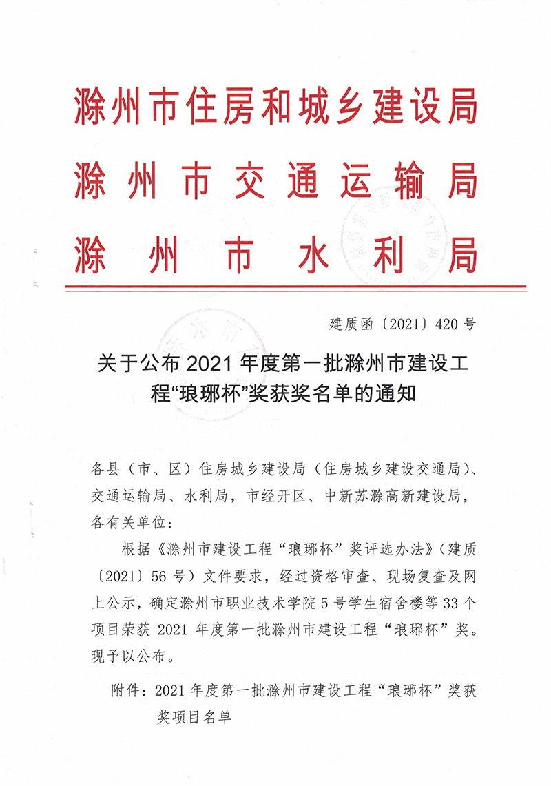 12月22日,安徽省滁州市住房和城鄉(xiāng)建設(shè)局、交通運(yùn)輸局、水利局聯(lián)合印發(fā)《關(guān)于公布2021年度第一批滁州市建設(shè)工程“瑯琊杯”獲獎(jiǎng)名單的通知》,安徽新建控股集團(tuán)承建的全椒縣站前路道路及火車(chē)站廣場(chǎng)改造工程榜上有名。