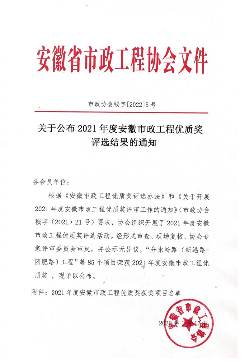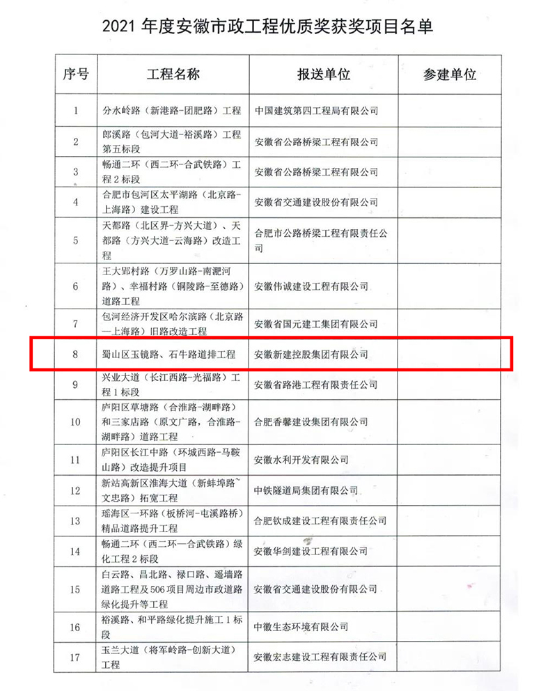 2022年1月17日,安徽省市政工程協(xié)會公布了2021年度安徽省市政工程優(yōu)質獎評選結果的通知,經(jīng)形式審查、現(xiàn)場復核、協(xié)會專家評審委員會審定,并公示無異議,安徽新建控股集團有限公司承建的四項工程榮獲“2020年度安徽省市政工程優(yōu)質獎”!