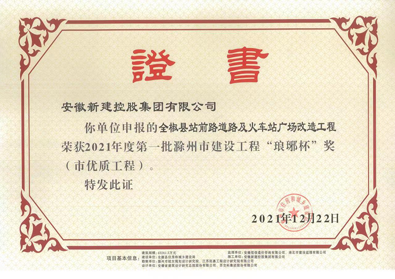 近日,集團(tuán)公司收到由安徽省滁州市住房和城鄉(xiāng)建設(shè)局頒發(fā)的證書,公司承建的全椒縣站前路道路及火車站廣場(chǎng)改造工程榮獲2021年度第一批滁州市建設(shè)工程“瑯琊杯”獎(jiǎng)(市優(yōu)質(zhì)工程)。