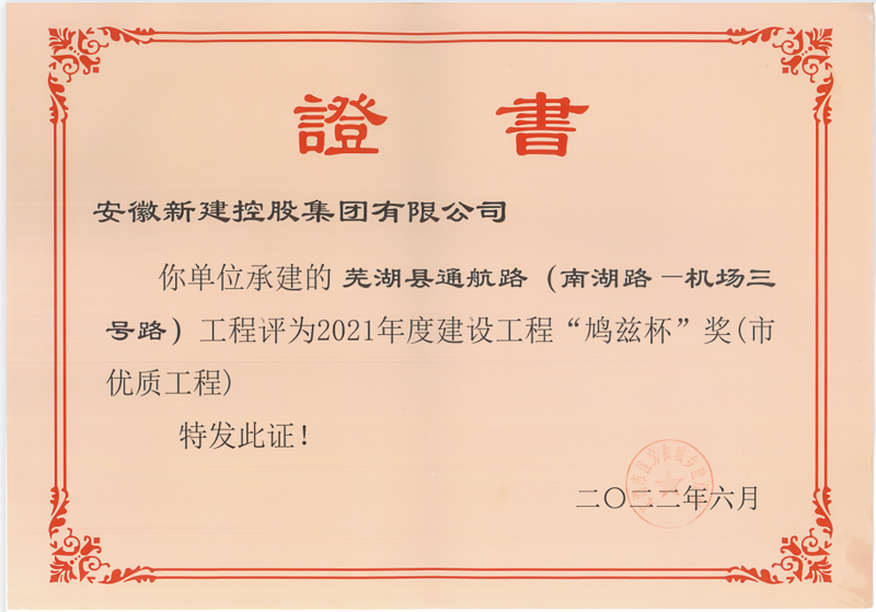 近日,根據(jù)《蕪湖市住房城鄉(xiāng)建設(shè)局關(guān)于印發(fā)蕪湖市建設(shè)工程“鳩茲杯”獎(市優(yōu)質(zhì)工程)評選表彰辦法的通知》,經(jīng)企業(yè)申報、專家評審、會議審定、網(wǎng)上公示等程序,安徽新建承建的蕪湖縣通航路(南湖路——機場三號路)工程榮獲蕪湖市建設(shè)工程“鳩茲杯”優(yōu)質(zhì)工程獎。
