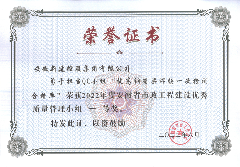 其中,集團公司勇于擔當QC小組“提高鋼箱梁焊接一次檢測合格率”、創(chuàng)無止境QC小組“降低CFG樁混凝土超方率”同時獲得2022年度安徽省市政工程建設優(yōu)秀質(zhì)量管理小組一等獎;勇往直前QC小組“降低多跨度蓋梁施工成本”獲得2022年度安徽省市政工程建設優(yōu)秀質(zhì)量管理小組二等獎。