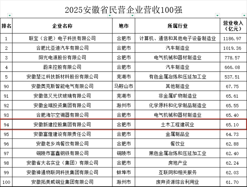 熱烈祝賀安徽新建控股集團(tuán)榮登2025年安徽省民營企業(yè)營收百強(qiáng)榜單第94位
