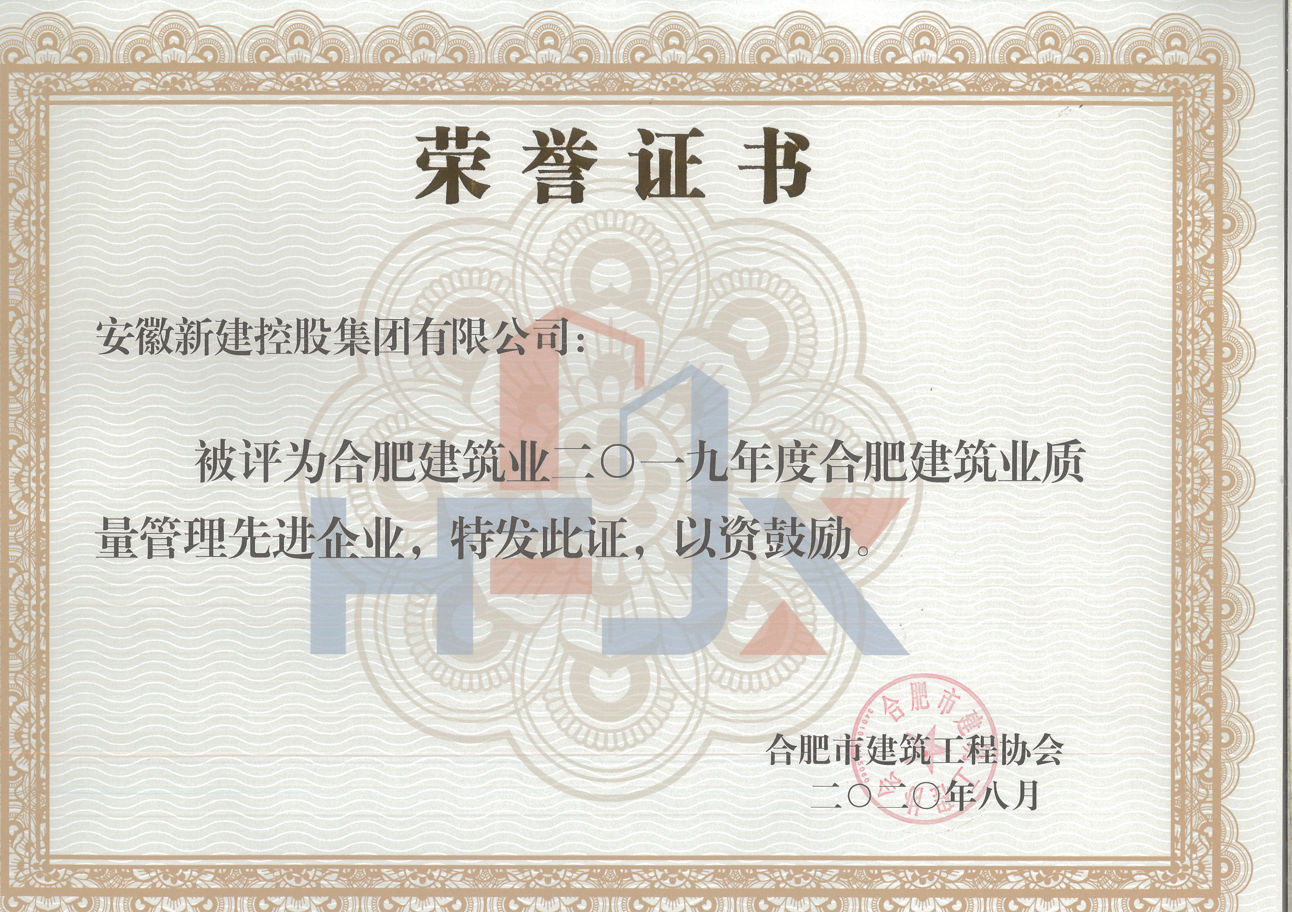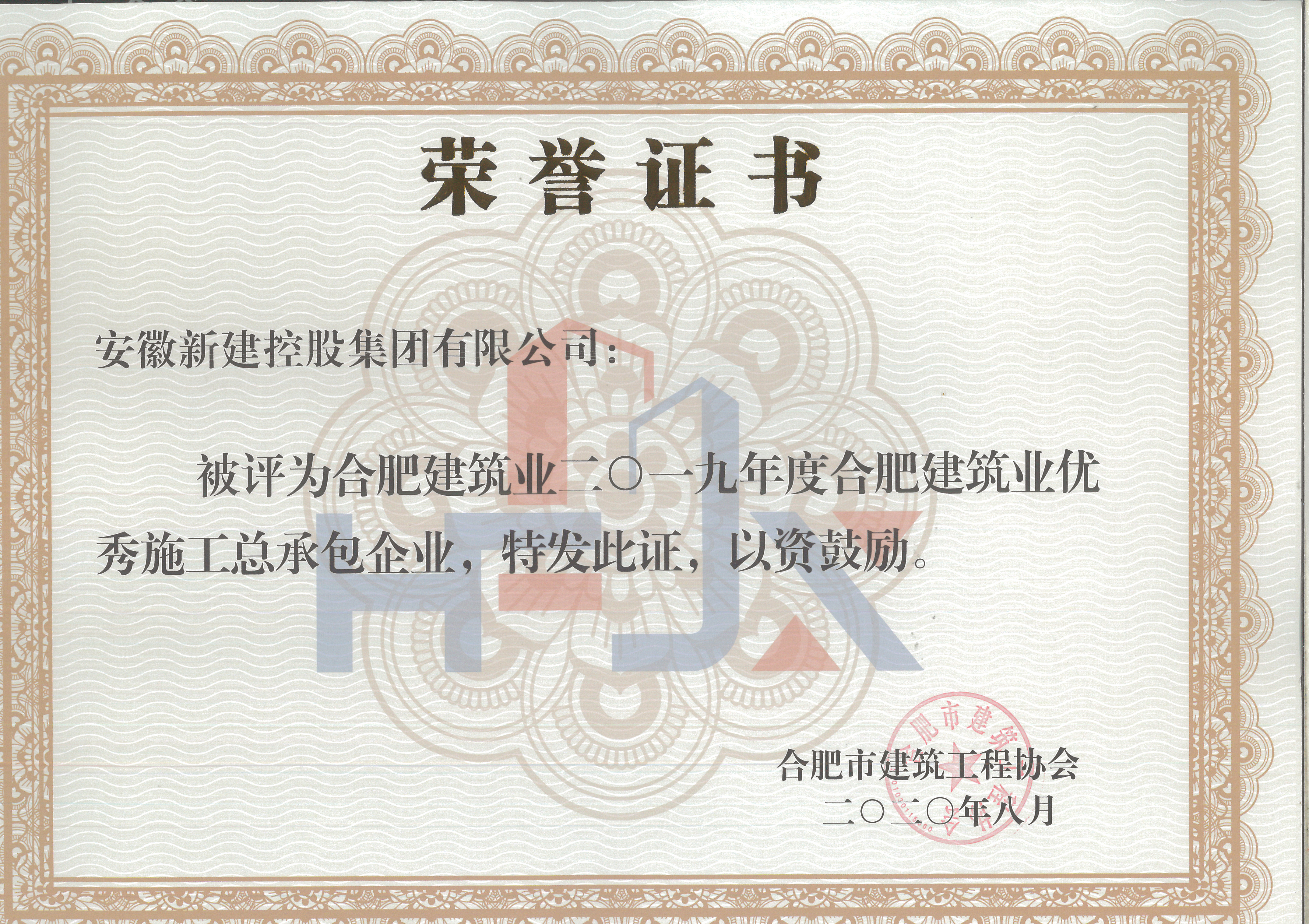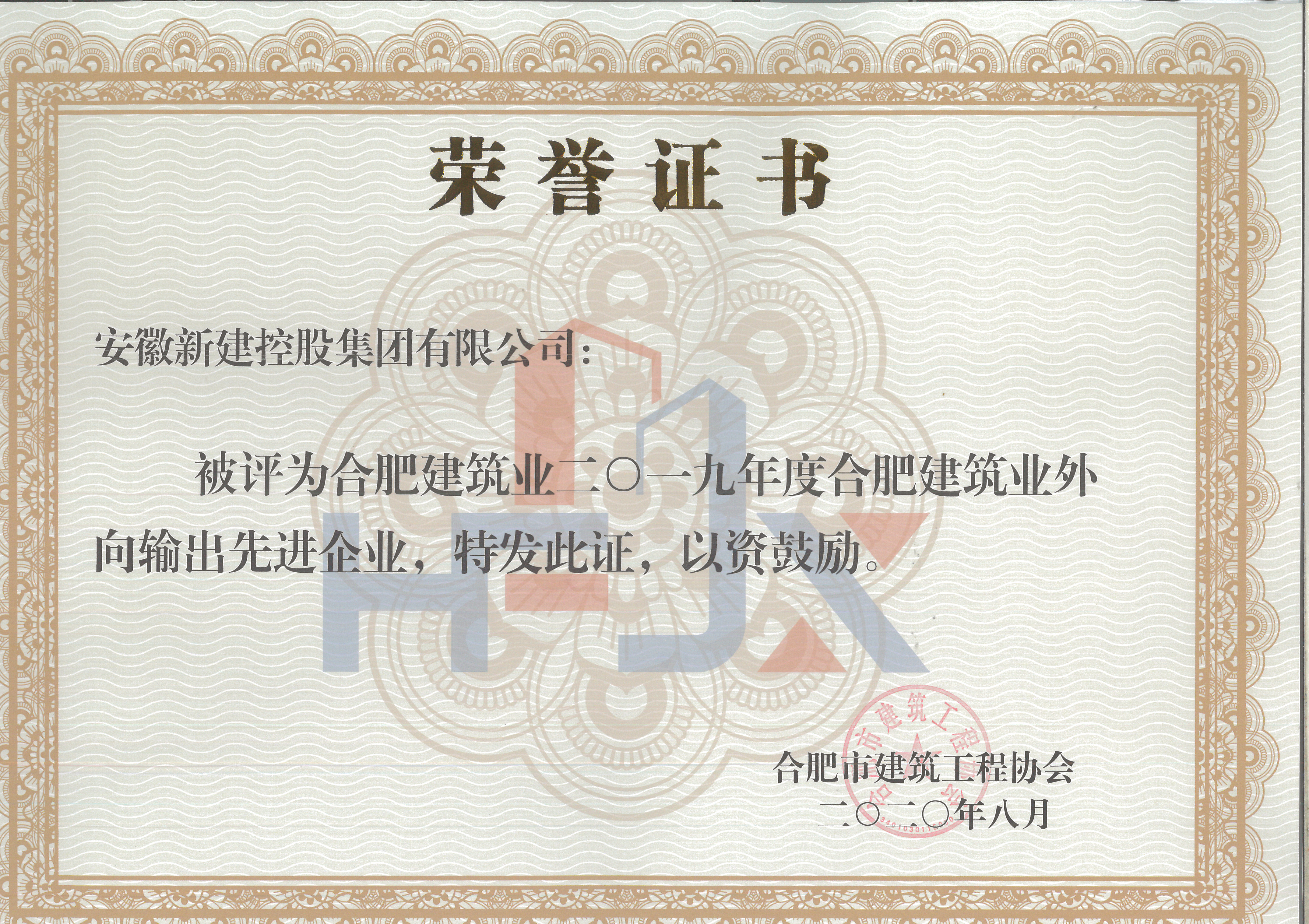 熱烈祝賀我公司獲得2019年合肥市建筑業(yè)企業(yè)50強、2019年合肥市建筑業(yè)優(yōu)秀施工總承包企業(yè)、2019年合肥市建筑業(yè)外向輸出先進企業(yè)、2019年合肥市建筑業(yè)質(zhì)量管理先進企業(yè)稱號?。?!