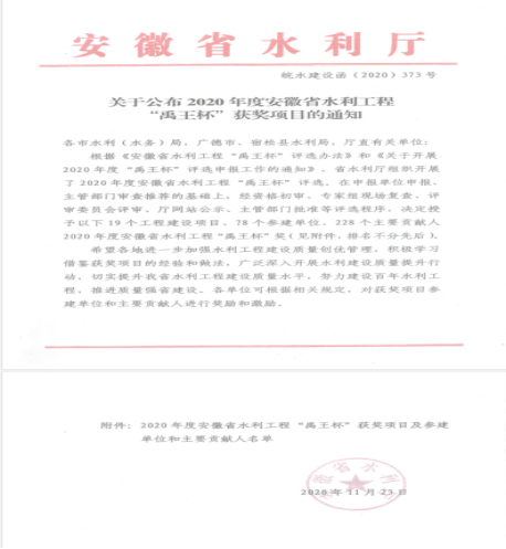 近日,根據(jù)《安徽省水利工程“禹王杯”評選辦法》和《關(guān)于開展2020年度“禹王杯”評選申報工作的通知》,在省水利廳組織開展的評選活動中,經(jīng)資格初審、專家組現(xiàn)場復(fù)查、評審委員會評審、公示,主管部門批準(zhǔn)等程序,由安徽新建控股集團(tuán)有限公司施工的“黃山風(fēng)景區(qū)麻川河丹井口至洗藥橋段防洪治理工程施工2標(biāo)”工程脫穎而出,被安徽省水利廳綜合評定為“2020年度安徽省水利工程‘禹王杯’獎”!
