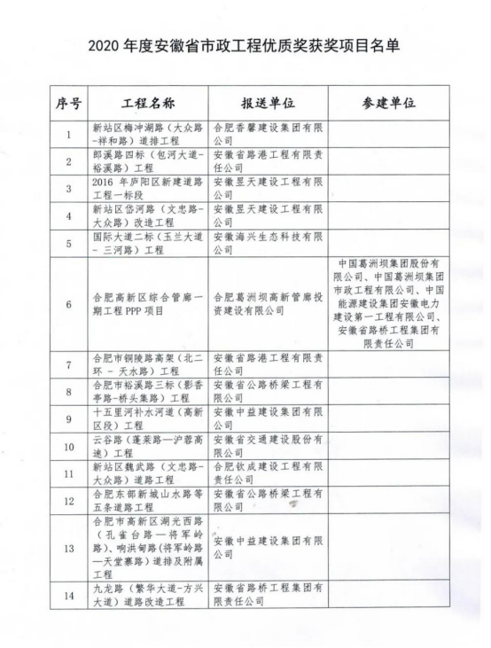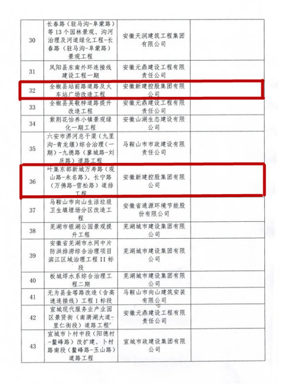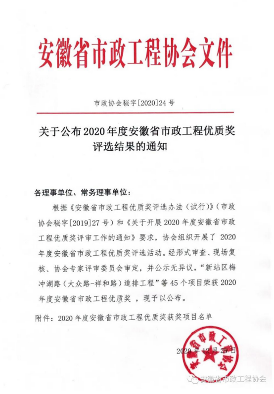 2020年12月29日,根據(jù)《安徽省市政工程優(yōu)質(zhì)獎(jiǎng)評(píng)選辦法(試行)》(市政協(xié)會(huì)秘字【2019】27號(hào))和《關(guān)于開(kāi)展2020年度安徽省市政工程優(yōu)質(zhì)獎(jiǎng)評(píng)審工作的通知》要求,在協(xié)會(huì)組織開(kāi)展評(píng)選活動(dòng)中,經(jīng)形式審查、現(xiàn)場(chǎng)復(fù)核、專家評(píng)審委員會(huì)審定,由安徽新建控股集團(tuán)有限公司施工的全椒縣站前路道路及火車站廣場(chǎng)改造工程、岳西縣店前濱河新區(qū)店前河綜合治理建設(shè)項(xiàng)目3標(biāo)段、葉集東部新城萬(wàn)壽路(觀山路-未名路)、長(zhǎng)寧路(萬(wàn)佛路-雪松路)道排工程,三項(xiàng)工程榮獲“2020年度安徽省市政工程優(yōu)質(zhì)獎(jiǎng)”!