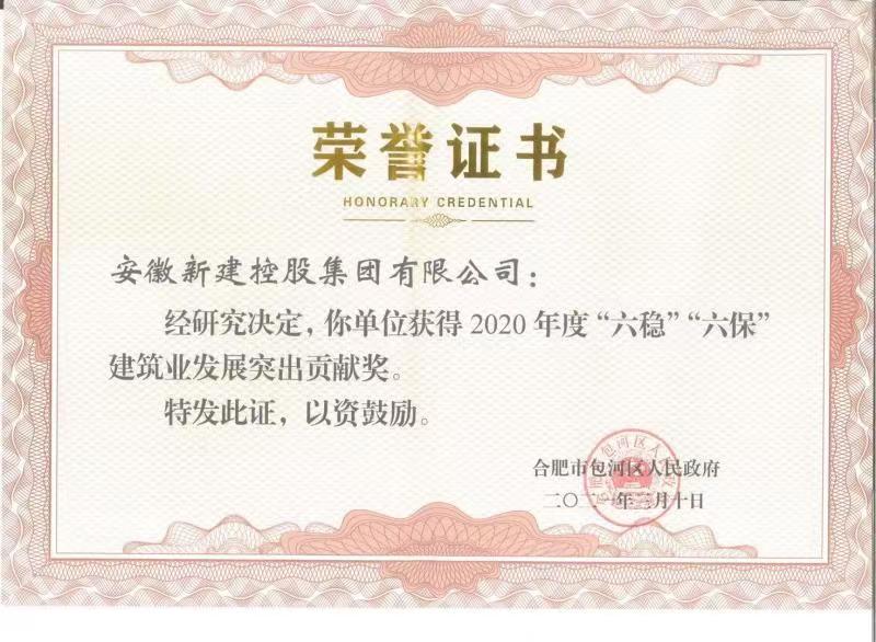 熱烈祝賀安徽新建控股集團有限公司榮獲2020年度“六穩(wěn)”“六?!苯ㄖI(yè)發(fā)展突出貢獻獎!