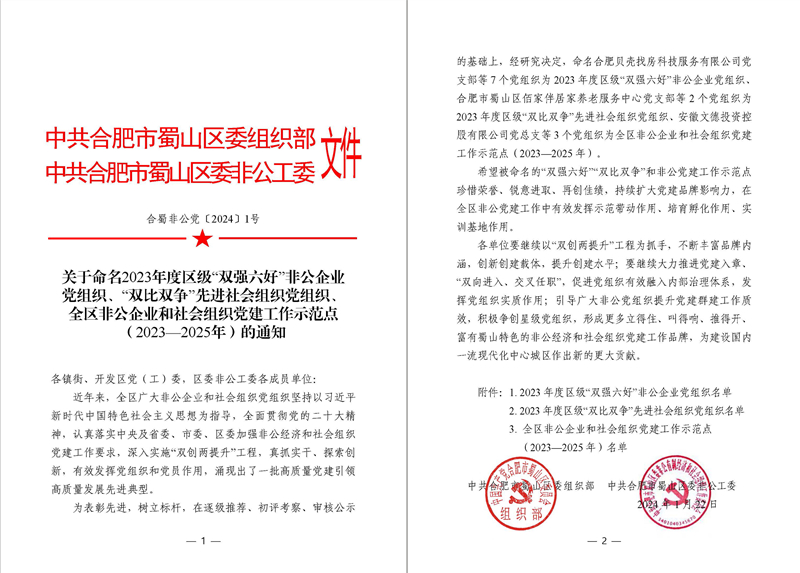 1月22日,中共合肥市蜀山區(qū)委組織部、中共合肥市蜀山區(qū)委非公工委聯(lián)合發(fā)文,命名2023年度區(qū)級“雙強六好”非公企業(yè)黨組織、“雙比雙爭”先進社會組織黨組織和全區(qū)非公企業(yè)和社會組織黨建工作示范點,集團公司黨支部作為先進典型,以及在非公黨建工作中發(fā)揮的示范引領(lǐng)作用,被授予2023年度蜀山區(qū)“雙強六好”非公企業(yè)黨組織榮譽稱號。