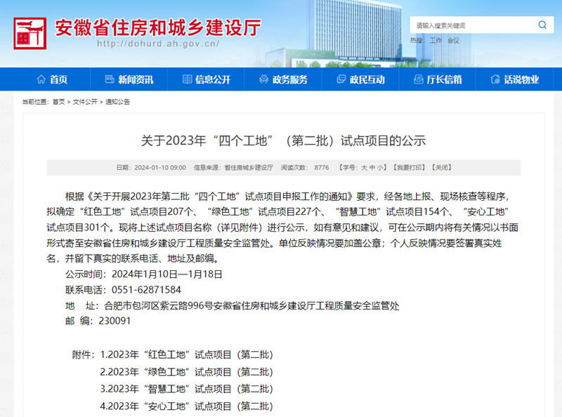 近日,安徽省住房和城鄉(xiāng)建設(shè)廳網(wǎng)站公布了2023年“四個(gè)工地”(第二批)試點(diǎn)項(xiàng)目的名單,集團(tuán)公司承建項(xiàng)目濱湖新區(qū)貴杭小學(xué)、包河區(qū)全民健身中心工程總承包、包河BH202214地塊項(xiàng)目總包工程獲得“紅色工地”試點(diǎn)稱號(hào),其中包河區(qū)全民健身中心工程總承包同時(shí)獲評(píng)“綠色工地”稱號(hào)。