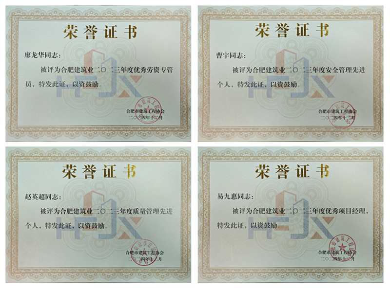 近日,集團(tuán)公司榮獲合肥市建筑工程協(xié)會(huì)頒發(fā)的“合肥市建筑業(yè)2023年度優(yōu)秀施工企業(yè)”證書(shū),公司員工易九惠被授予“合肥建筑業(yè)2023年度優(yōu)秀項(xiàng)目經(jīng)理”稱(chēng)號(hào),廖龍華、曹宇、趙英超被授予“合肥建筑業(yè)2023年度優(yōu)秀勞資專(zhuān)管員、質(zhì)量管理先進(jìn)個(gè)人”稱(chēng)號(hào)。