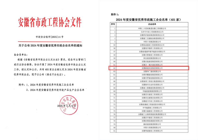 近日,安徽省市政工程協(xié)會發(fā)布通知,根據(jù)《安徽省優(yōu)秀市政施工企業(yè)認(rèn)定辦法》和《安徽省市政施工企業(yè)優(yōu)秀建造師(項(xiàng)目經(jīng)理)認(rèn)定辦法》要求,經(jīng)各市主管部門或行業(yè)協(xié)會推薦,經(jīng)認(rèn)定和公示,安徽新建控股集團(tuán)有限公司榮獲2024年度安徽省優(yōu)秀市政施工企業(yè)榮譽(yù)稱號。