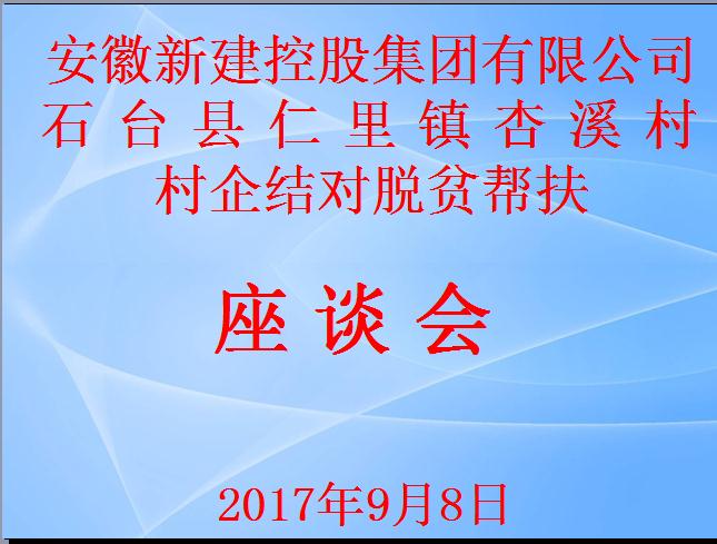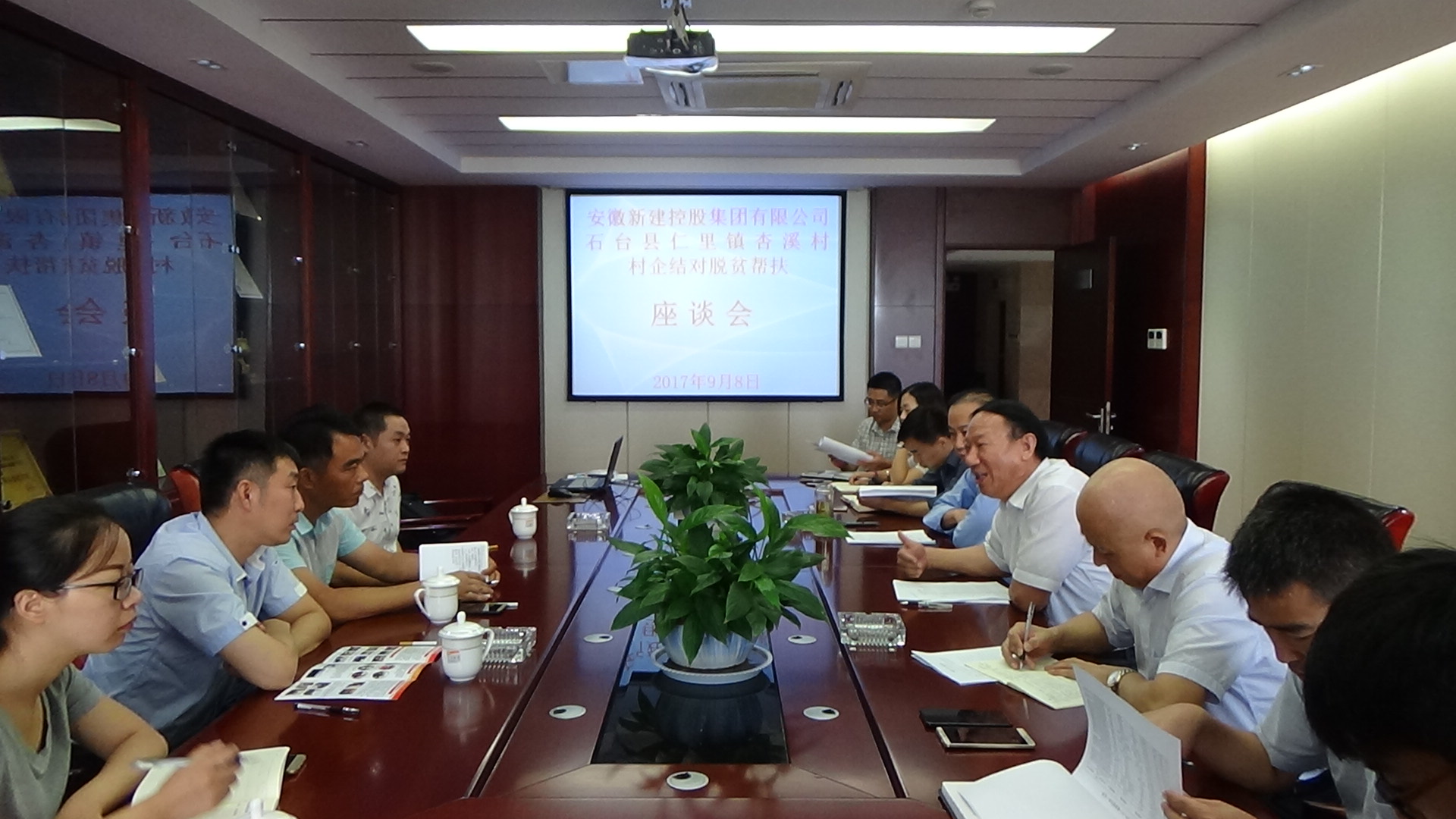 2017年9月8日,我公司村企結(jié)對脫貧幫扶對象石臺縣仁里鎮(zhèn)杏溪村的村委書記雷霆一行來我公司座談,安徽新建控股集團(tuán)有限公司董事長王杰英等相關(guān)領(lǐng)導(dǎo)參加了座談會,雷書記對杏溪村的脫貧情況進(jìn)行了詳細(xì)介紹,公司領(lǐng)導(dǎo)對杏溪村脫貧幫扶給出了初步計劃和方案,村企雙方對座談效果感到滿意。