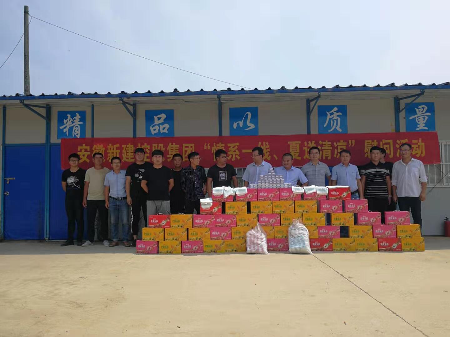 為切實做好夏季防暑降溫工作,確保一線員工的身體健康和安全生產(chǎn),2019年7月24日,安徽新建控股集團(tuán)有限公司行政總監(jiān)賀軍、財務(wù)總監(jiān)葉炳宏、總工程師李小寶、人力資源部經(jīng)理廖龍華一行,到全椒縣各項目部組織開展“情系一線、夏送清涼”慰問活動,為項目工地的一線員工送去防暑降溫物品。