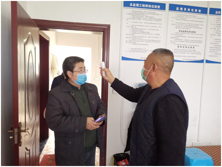 夏局長一行對項目部疫情防控的各項措施落實情況進行檢查,并進行體溫測量及登記。