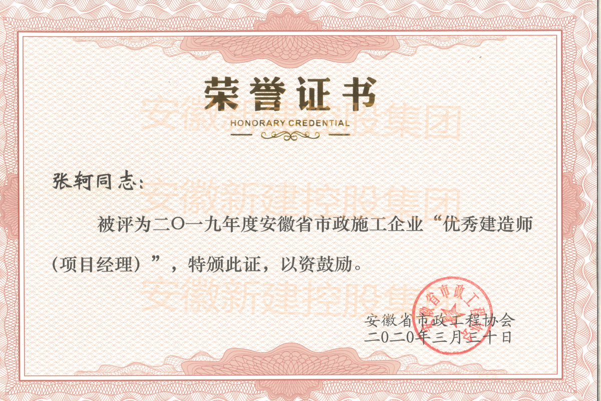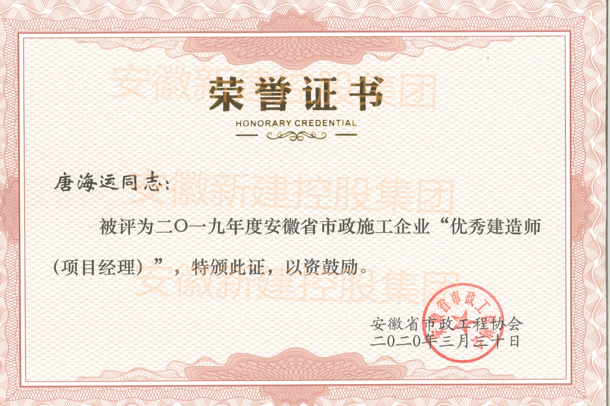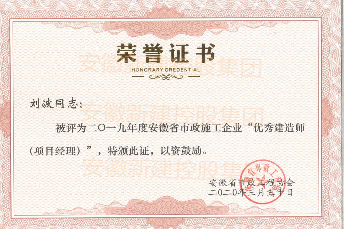 近日,經安徽省市政工程協(xié)會組織評審,集團公司副總經理劉波、工程管理部張珂、省外市場部唐海運三人,被評為2019年度安徽省市政施工企業(yè)“優(yōu)秀建造師(項目經理)”。